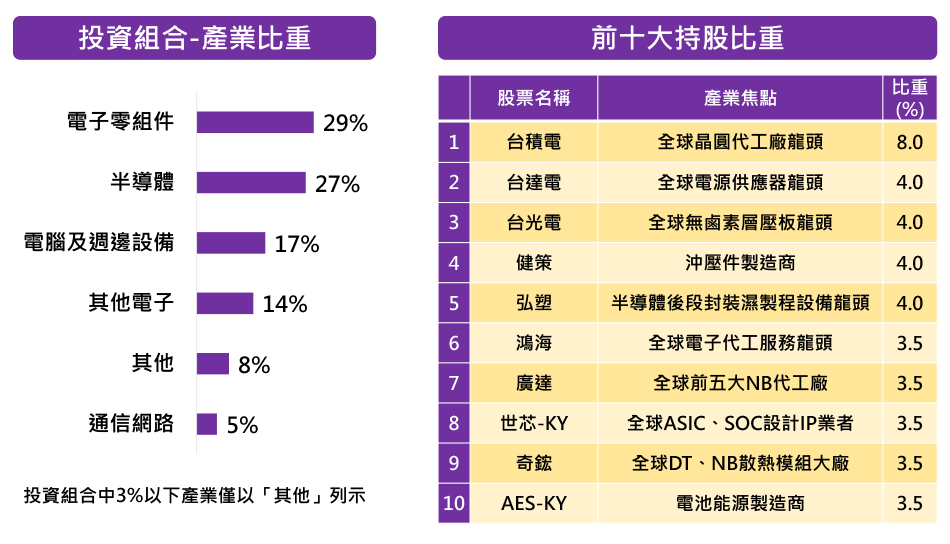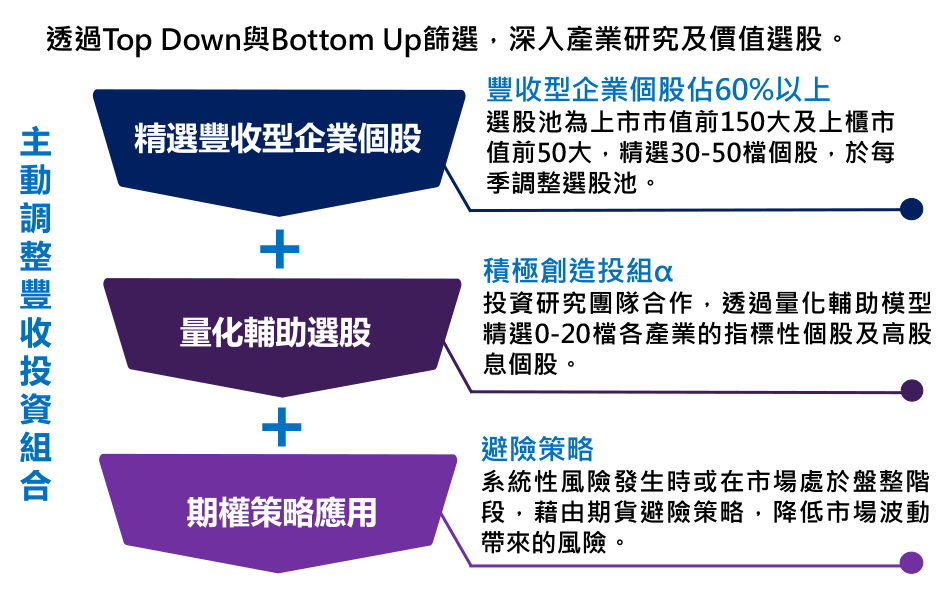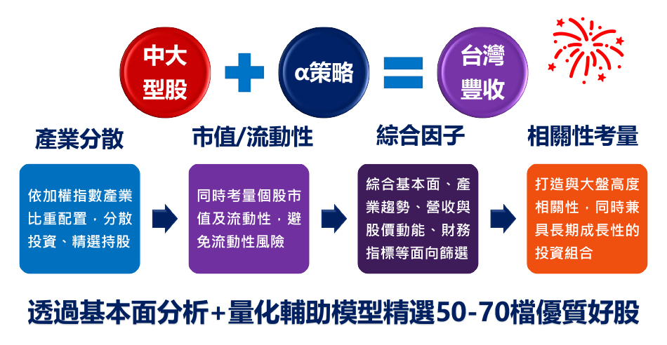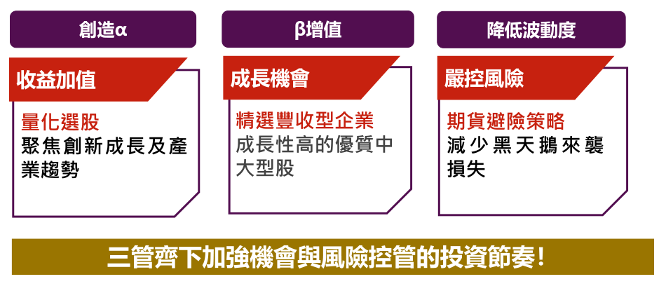 基金投資於台灣上市櫃個股,主要包括豐收型企業個股(β增值)及部分成長創新指標性企業(創造α)。透過紮實的產業及個股基本面研究,輔以量化選股模型,強化投資績效,並透過期貨避險策略以及多元產業分散投資,靈活調整資產配置,降低波動風險。