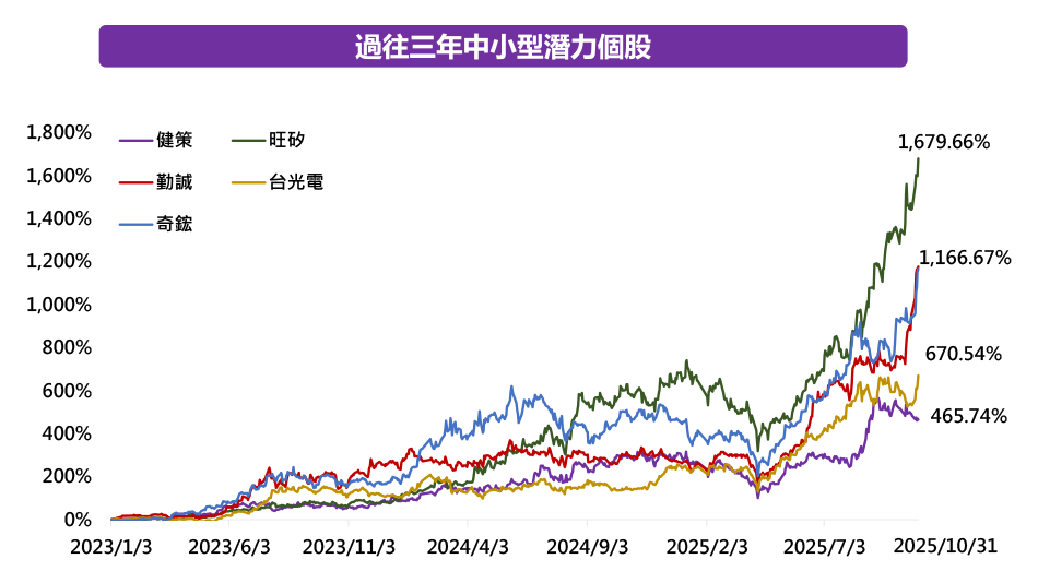資料來源:臺灣證券交易所,資料期間:2023/1/3~2025/10/31。以上個股非為股票推薦之意,僅為示意參考,投資人須衡量自身之投資風險。內容涉及個股(或投資標的或產業),僅為參考舉例,不代表個股(或投資標的或產業)之推薦,且不代表本基金未來投組之必要持股或投資標的,投資人須衡量自身之投資風險。本基金為主動式交易所交易基金,故投資目標未追蹤、模擬或複製特定指數之表現,而係本證券投資信託事業依所訂投資策略進行基金投資。兆豐投信整理;資料期間:2025/11。