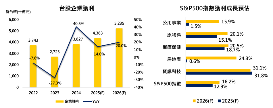 - S&P500指數2025年、2026年預估獲利成長分別為12.9%、16.2%,而2026年獲利成長動能不再是資訊科技一枝獨秀。