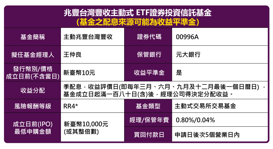 資料來源:兆豐投信整理;資料期間:2025/11。*風險報酬等級為本公司依投信投顧公會「基金風險報酬等級分類標準」編製,該分類標準係計算過去5年基金淨值波動度標準差,以標準差區間予以分類等級,分類為RR1-RR5五級,數字越大代表風險越高。此等級分類係基於一般市場狀況反映市場價格波動風險,無法涵蓋所有風險(如:投資標的產業風險及流動性風險等),不宜作為投資唯一依據。投資人仍應注意所投資基金個別的風險。請投資人注意申購基金前應詳閱基金公開說明書,充分評估基金投資特性與風險。有關本基金運用限制及投資風險之揭露,請詳見基金公開說明書。本基金為主動式交易所交易基金,故投資目標未追蹤、模擬或複製特定指數之表現,而係本證券投資信託事業依所訂投資策略進行基金投資。