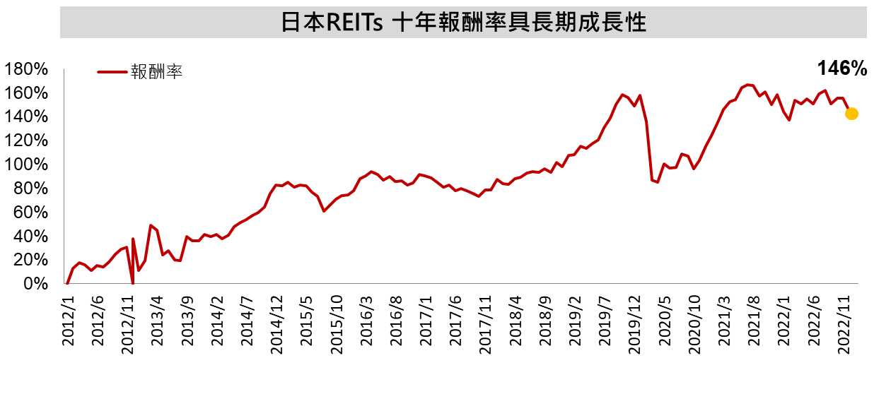 資料來源:彭博資訊,兆豐投信整理,2023/1。註:J-REITs報酬率採用彭博系統中指數【TSE REIT TR Index】2012/1/31-2022/12/31數據。