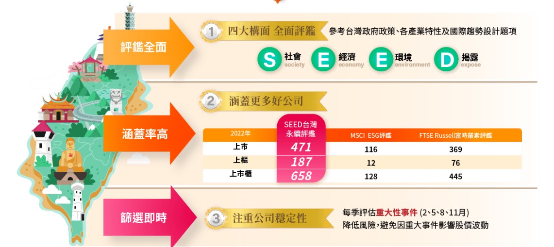 資料來源:臺北大學企業永續發展研究中心;兆豐投信整理,2023/6。(本基金屬環境、社會及治理(ESG)相關主題基金,永續相關重要發行資訊之揭露請詳見公開說明書,定期評估資訊將於公司網站(https://www.megafunds.com.tw/MEGA/about/governanceall.aspx)公告。)