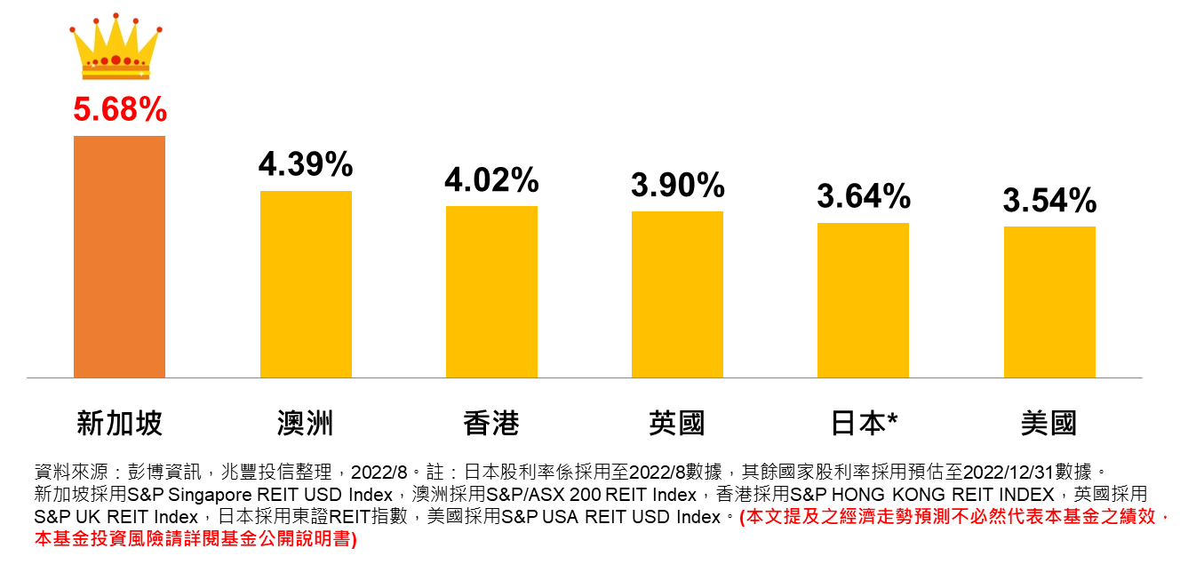 新加坡REITs的股利相較其他REITs市場是特別突出的,從2022年各國REITs預估股利率排行榜,新加坡居冠達5.68%!想要領高股息的存股族一定不能錯過新加坡。