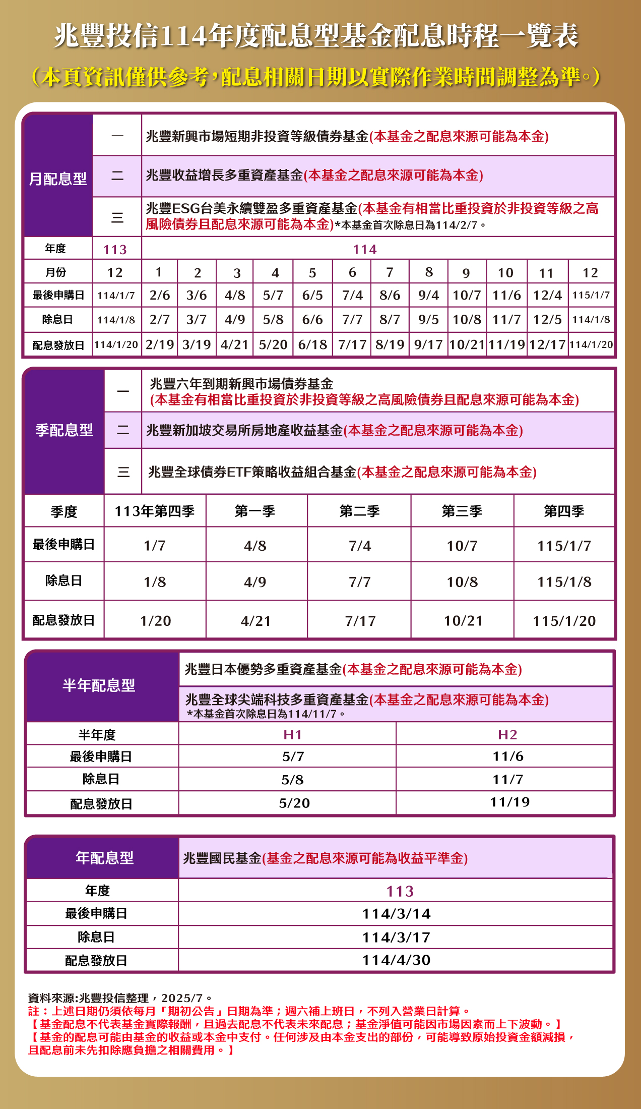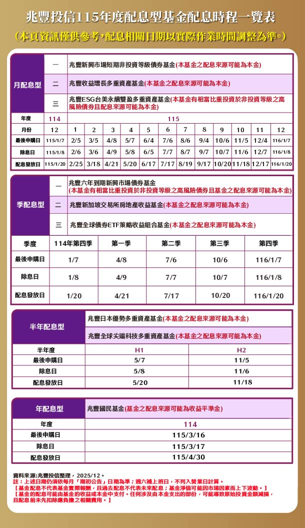 基金配息不代表基金實際報酬,且過去配息不代表未來配息;基金淨值可能因市場因素而上下波動。基金的配息可能由基金的收益或本金中支付。任何涉及由本金支出的部份,可能導致原始投資金額減損。本基金配息前未先扣除應負擔之相關費用。本基金配息組成項目,可於經理公司網站(https://www.megafunds.com.tw)查詢。基金非存款或保險,故無受存款保險、保險安定基金或其他相關保障機制之保障。